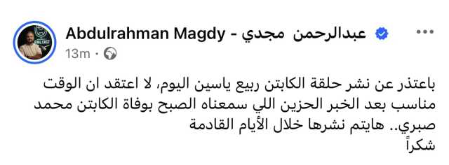 وكتب عبدالرحمن مجدي عبر حسابه الشخصي على فيسبوك: “باعتذر عن نشر حلقة الكابتن ربيع ياسين اليوم، لا اعتقد ان الوقت مناسب بعد الخبر الحزين اللي سمعناه الصبح بوفاة الكابتن محمد صبري.