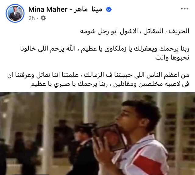 وقال ماهر في منشور له عبر حسابه الشخصي بموقع فيسبوك: "الحريف، المقاتل، الأشول أبو رجل شومة.. ربنا يرحمك ويغفرلك يا زملكاوي يا عظيم. الله يرحم اللي خالونا نحبوها وإنت من أعظم الناس اللي حبيبتنا في الزمالك.