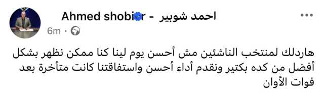 وقال شوبير في منشور عبر حسابه الشخصي بموقع فيسبوك: “هاردلك لـ منتخب الناشئين، مش أحسن يوم لينا. كنا ممكن نظهر بشكل أفضل من كده بكتير ونقدم أداء أحسن، واستفاقتنا كانت متأخرة بعد فوات الأوان”.