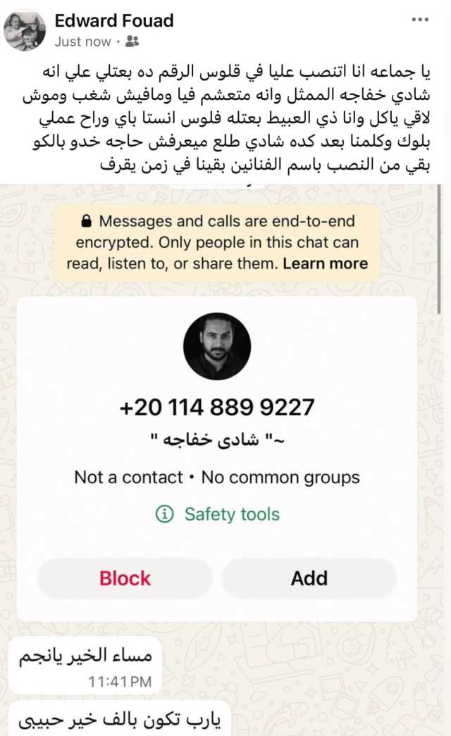 وقال إدوارد في منشور له عبر حسابه الشخصي بموقع فيسبوك: “يا جماعة أنا اتنصب عليا… الرقم ده بعتلي على إنه شادي خفاجة، وقال إنه مش لاقي ياكل ومتعشم فيا، وأنا صدقته وبعتله فلوس إنستا باي، وراح عمللي بلوك.