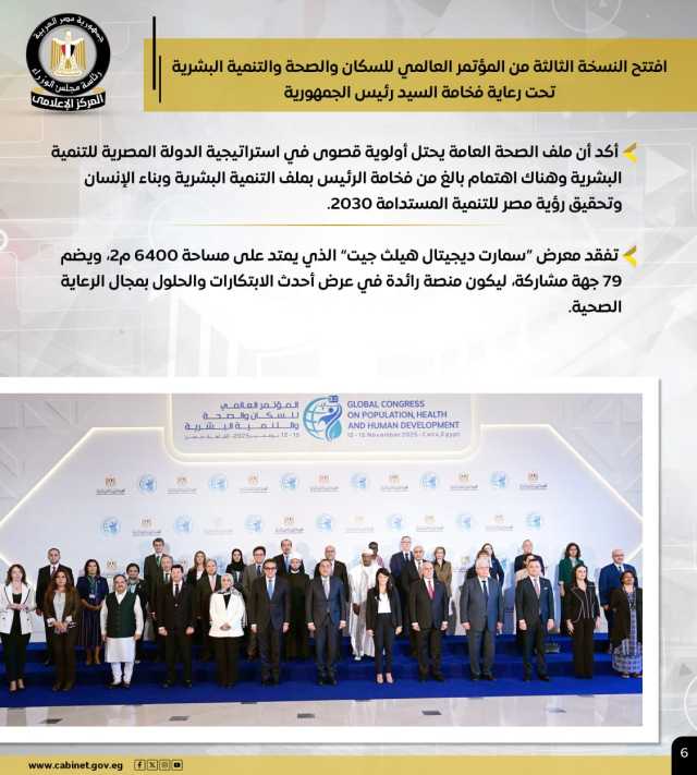 ويأتي المؤتمر العالمي الثالث للسكان والصحة والتنمية البشرية في إطار حرص الدولة المصرية على تعزيز الاستثمار في الإنسان، باعتباره الركيزة الأساسية للتنمية، ومواصلة الجهود الوطنية المبذولة لتحقيق التوازن بين النمو السكاني ومتطلبات التنمية المستدامة.