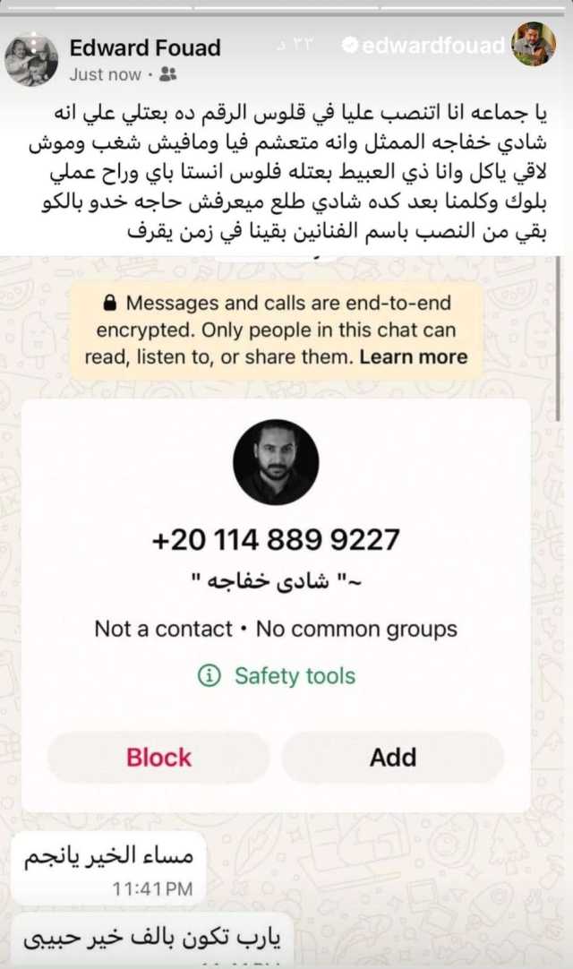 مضيفا: "للأسف، تم استغلال طيبة الأستاذ إدوارد وتعرض لموقف غير مقبول، أي حد اتعرض لنفس الموقف يا ريت يبعتلي التفاصيل في رسالة خاصة، علشان بجمع كل البيانات والإجراءات القانونية بالفعل بدأت، برجاء التأكد عند التعامل مع أي رقم غير رقمي المعروف والوحيد اللي معايا من سنوات (ينتهي بـ 010)، التحذير ده لحماية الجميع ومنع أي استغلال.