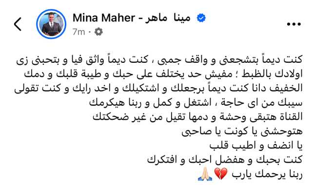 نعى الإعلامي مينا ماهر صديقه الراحل محمد صبري بكلمات مؤثرة، عبّر خلالها عن حزنه العميق لفقدانه.