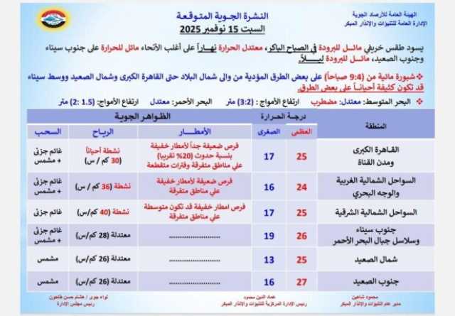 كشفتِ الهيئة العامة للأرصاد الجوية عن حالة الطقس اليوم السبت 15 نوفمبر 2025، موضحةً الظواهر الجوية ودرجات الحرارة المتوقعة في محافظات ومدن مصر.