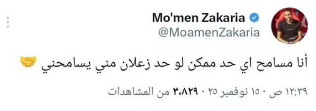 وكتب مؤمن زكريا عبر صفحته الرسمية على موقع «إكس»:«أنا مسامح أي حد، وممكن لو حد زعلان مني يسامحني».