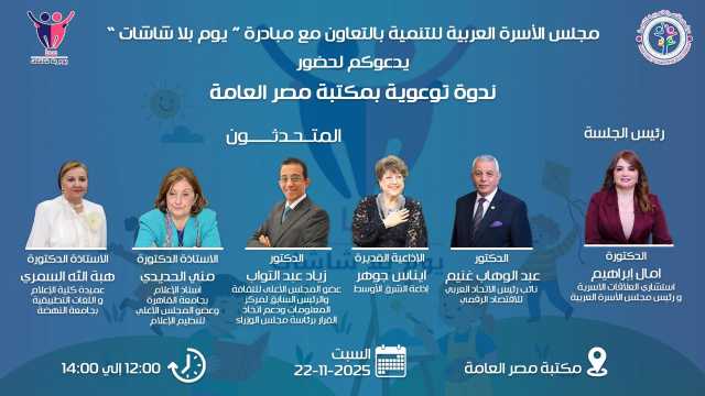يعقد مجلس الأسرة العربية للتنمية أحد مجالس الاتحاد العربي للتنمية المستدامة والبيئة، بالتعاون مع مبادرة "يوم بلا شاشات.. معًا نتواصل"، السبت المقبل، ندوة توعوية موسعة، في مكتبة مصر العامة، وذلك لتعزيز الوعي الأسري والإعلامي في مواجهة تحديات العصر الرقمي، تحت رعاية أ.د. منى الحديدي أستاذة الإعلام بجامعة القاهرة، وترأس الجلسة الدكتور آمال إبراهيم رئيس مجلس الأسرة العربية للتنمية، وبمشاركة نخبة من الخبراء والإعلاميين والمتخصصين في التنمية البشرية والإعلام الرقمي.