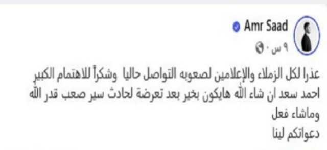 من جانبه، نشر عمرو سعد منشوراً على «فيسبوك» أعلن فيه عن الحادث، واعتذر عن صعوبة التواصل مع الزملاء والإعلاميين، وشكر الجمهور على اهتمامهم، مؤكداً أن أحمد سعد سيكون بخير.