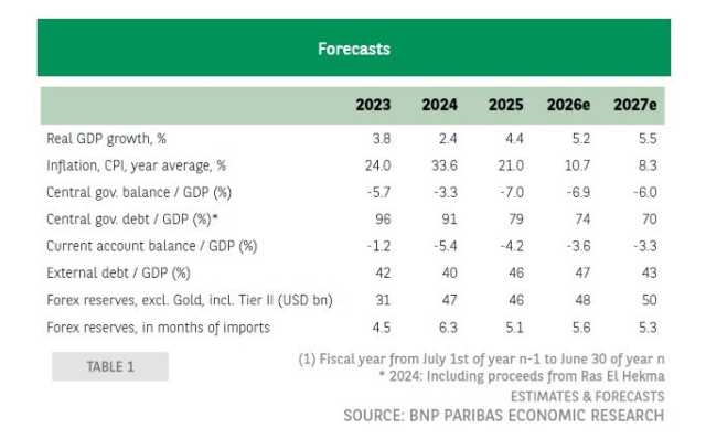 وعلى المدى القصير، يتوقع بنك بي إن بي باريبا أن يُحافظ الانخفاض التدريجي في عجز الحساب الجاري بمصر، مدعومًا بالنمو المستمر في عائدات السياحة وانتعاش النشاط في البحر الأحمر، إلى جانب التمويل الثنائي ومتعدد الأطراف (على سبيل المثال، صرف الاتحاد الأوروبي 7.4 مليار يورو خلال الفترة 2024-2027)، على سيولة العملات الأجنبية عند مستوى مُرضٍ.