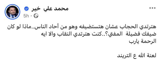 وكتب خير على حسابه الشخصي بموقع فيسبوك: "هترتدي الحجاب عشان هتستضيفه وهو من أحاد الناس..ماذا لو كان ضيفك فضيلة المفتي؟.. كنت هترتدي النقاب والا ايه الرحمة يارب، لعنة اللّٰه ع التريند".
