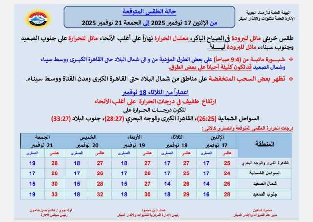 حالة الطقس .. أعلنت الهيئة العامة للأرصاد الجوية، أن البلاد تشهد خلال الفترة من 17 إلى 21 نوفمبر طقسًا خريفيًا يميل للبرودة في الصباح الباكر، بينما يكون معتدل الحرارة نهارًا على أغلب الأنحاء، يميل للحرارة على جنوب الصعيد وجنوب سيناء، ويعود ليصبح مائلًا للبرودة ليلًا.