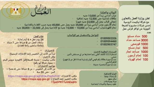 شروط التقديم للوظائف الجديدة داخل المشروعحددت وزارة العمل عددًا من الشروط الواجب توافرها في المتقدمين وتشمل أن يكون السن ما بين 18 وحتى 55 عامًا، إضافة إلى ضرورة اجتياز الاختبارات الفنية التي تُجرى بمدينة الضبعة يوميًا من الأحد إلى الخميس.