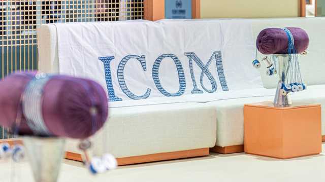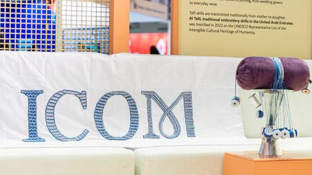 ويُبرز التصميم شعار «آيكوم» بدرجتين من اللون الأزرق، منسوجتين باستخدام أربع غرز تلي تقليدية هي: «فنخ البطيخ»، و«بروي/المشارة»، و«الفن»، و«الكولي». وتمثل كل غرزة إرثاً فنياً يعكس مهارة الحرفيات ويجسد تنوع النسيج الثقافي الإماراتي، فيما تتكامل هذه الغرز معاً لتجسيد شعار المؤتمر «مستقبل المتاحف في مجتمعات سريعة التغيير».