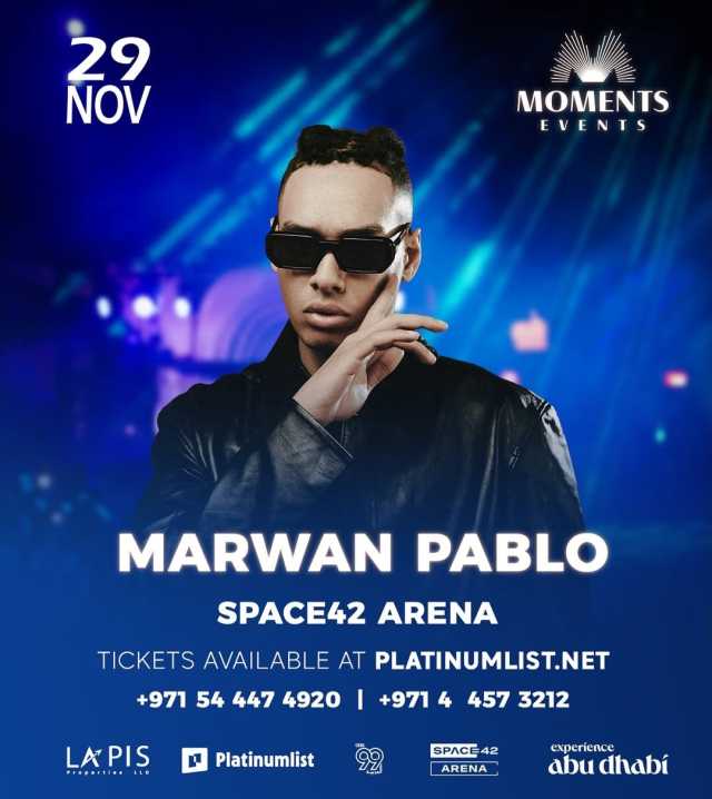 يستعد مطرب الراب مروان بابلو، لإحياء حفل غنائي في مدينة أبوظبي بدولة الإمارات العربية المتحدة، يوم 29 نوفمبر الجاري، ضمن سلسلة الحفلات الشتوية.
