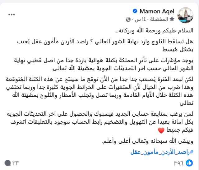 تحدث الراصد الجوي الأردني #مأمون_عقل، عن وجود #مؤشرات_جوية تشير إلى احتمال تأثر #الأردن بكتلة #هوائية_باردة جداً من أصل# قطبي نهاية الشهر الحالي، وفقاً لآخر التحديثات الجوية، بمشيئة الله تعالى.
