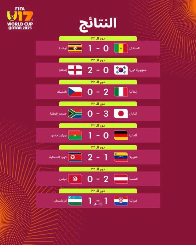 وضمنت اليوم السبت، 8 منتخبات تأهلها، حيث فازت #أوزبكستان على كرواتيا بركلات الترجيح 4- 3 عقب التعادل 1-1، وتغلبت النمسا على تونس 2-0، وأوغندا على السنغال بهدف وحيد، وإنجلترا على كوريا الجنوبية 2-0، وإيطاليا على التشيك بنفس النتيجة.