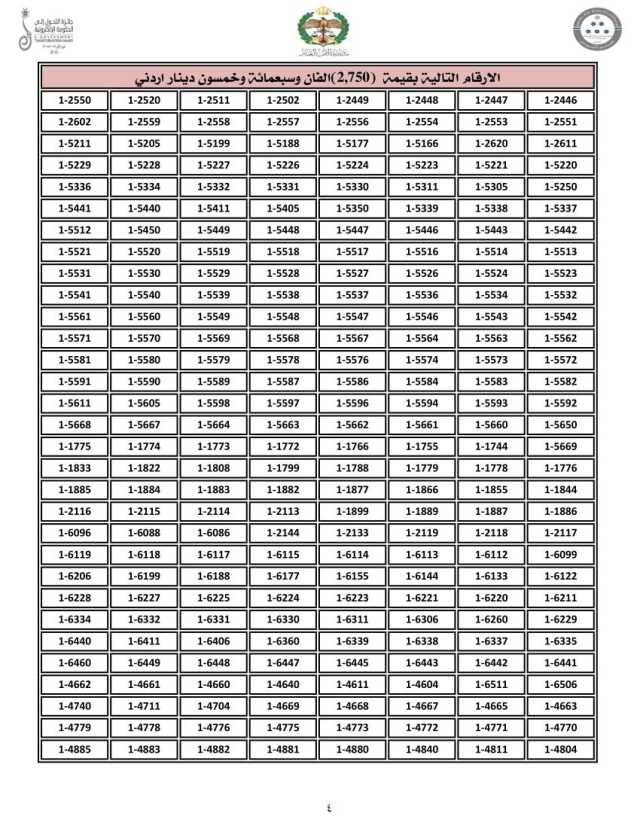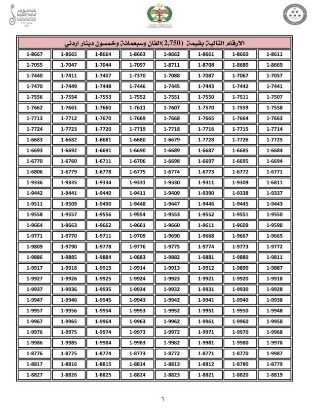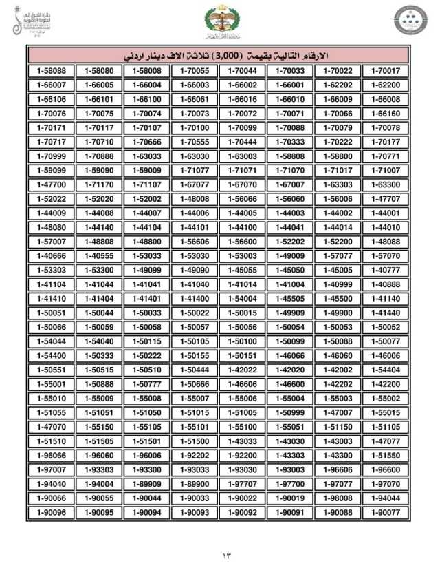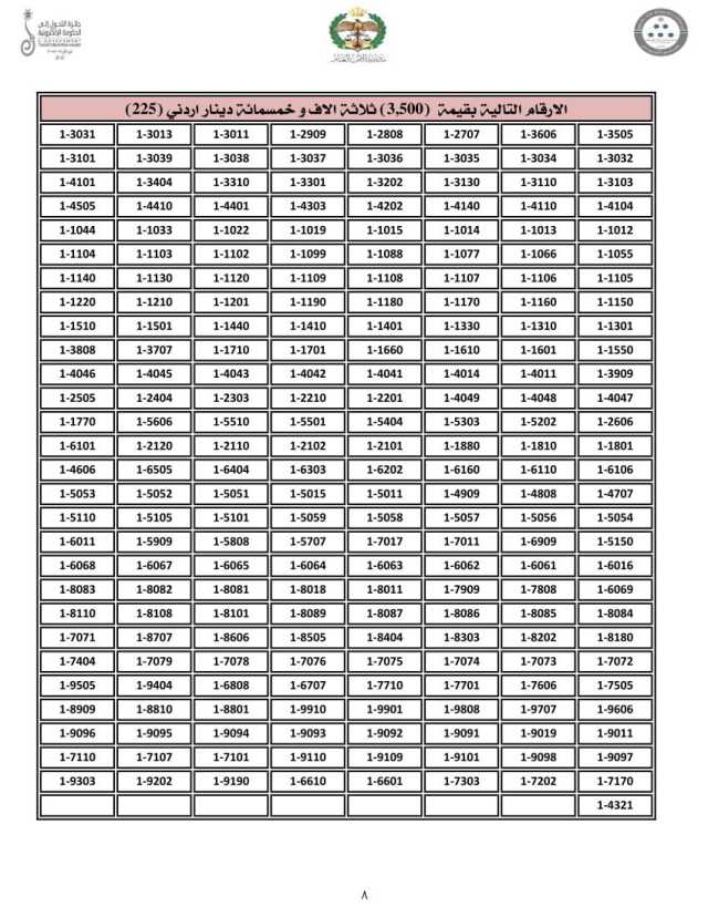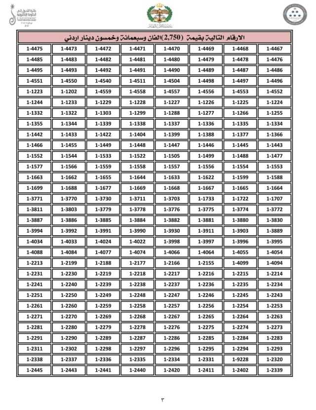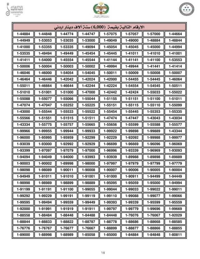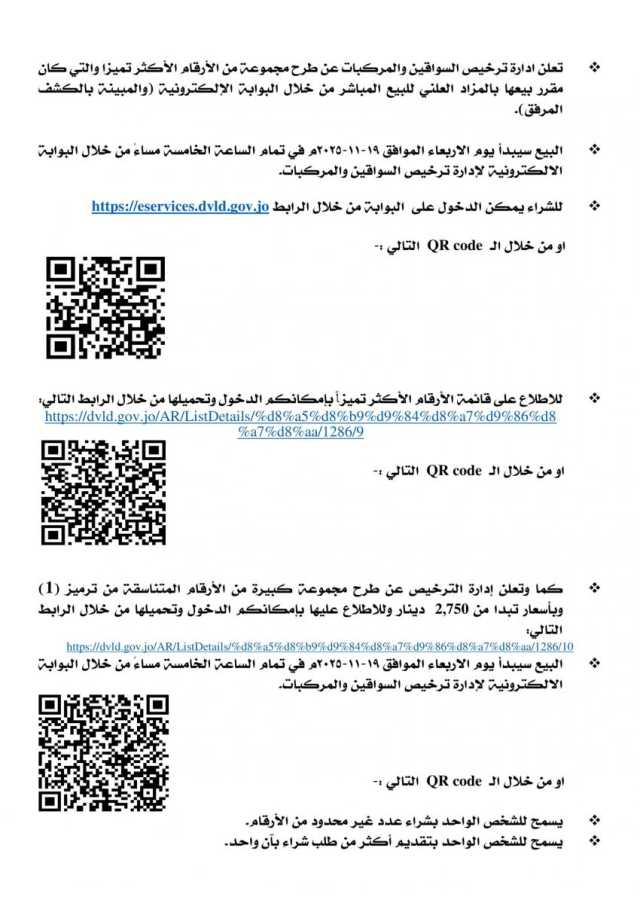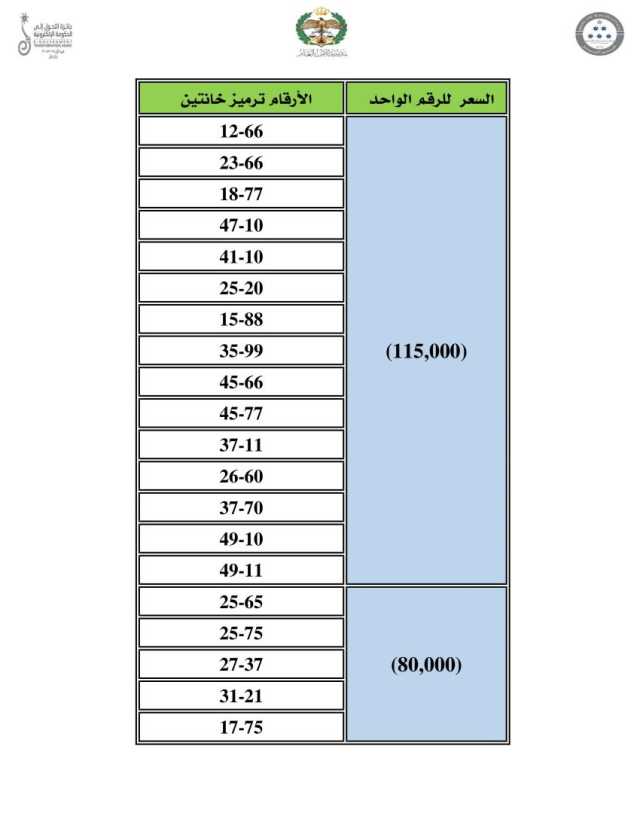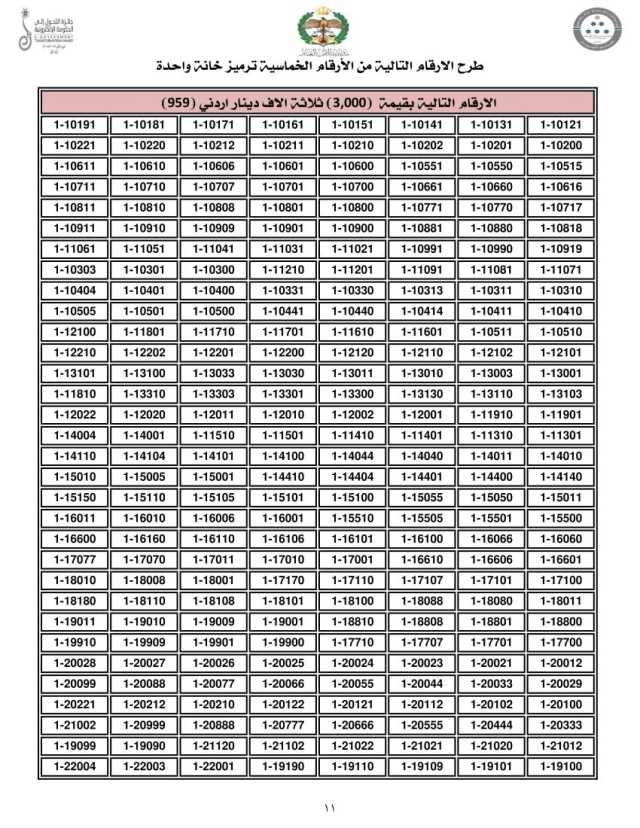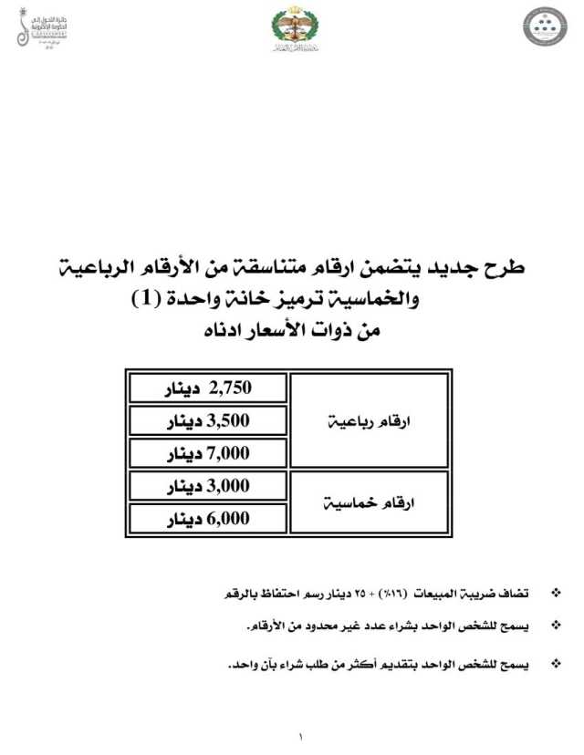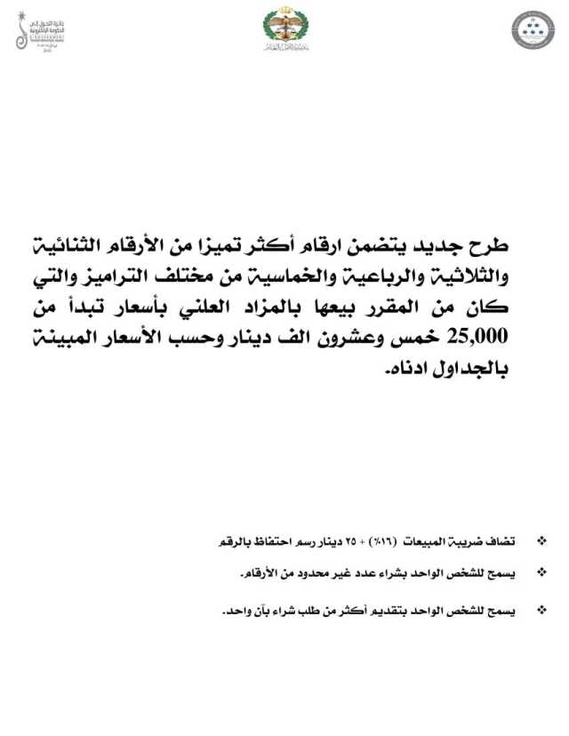 وستكون الأرقام ثنائية وثلاثية ورباعية وخماسية من مختلف الترميزات، والتي كان مقرراً بيعها بالمزاد العلني بأسعار تبدأ من 25 ألف دينار.