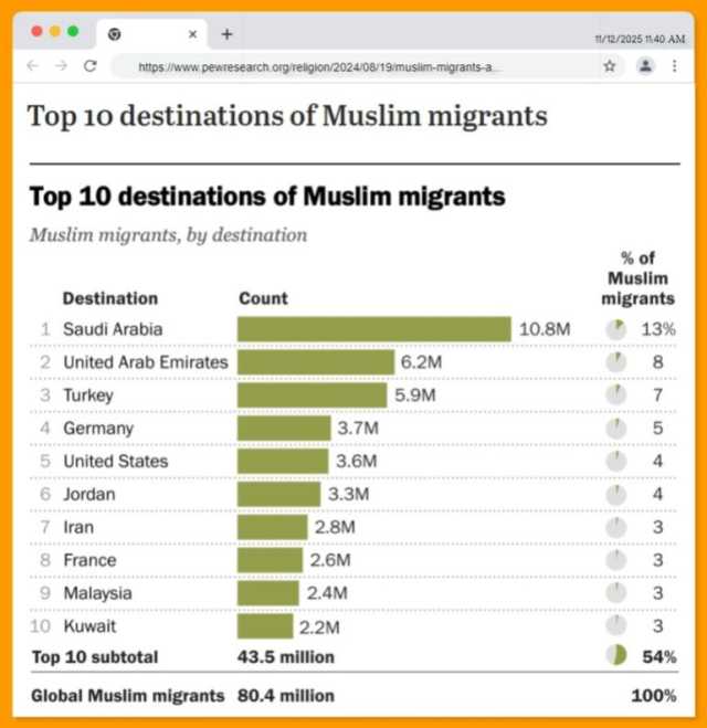 ويظهر التقرير الصادر في أغسطس/آب 2024 أن حركة المسلمين عبر الحدود لا تتركز في اتجاه الغرب كما يُروج في الحملات الرقمية، بل تبقى في الغالب داخل المناطق الإسلامية أو المجاورة لها، إذ استشهد بلجوء ملايين السوريين إلى تركيا ولبنان، وانتقال الأفغان إلى إيران وباكستان، وجميعها ذات غالبية أو حضور مسلم قوي.