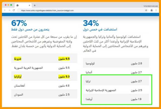 إعلانوتكذب الأرقام الحقيقية هذه المزاعم، إذ تشير بيانات المفوضية السامية للأمم المتحدة لشؤون اللاجئين إلى أن خمس دول فقط تستضيف أكثر من ثلث اللاجئين في العالم، وهي: كولومبيا (2.8 مليون لاجئ)، وألمانيا (2.7 مليون)، وتركيا (2.7 مليون)، وإيران (2.5 مليون)، وأوغندا (1.9 مليون).