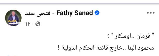 وأكد الناقد الرياضي فتحي سند، أن أوسكار رئيس لجنة الحكام اخد قرار باستبعاد الحكم محمود البنا من القايمة الدولية