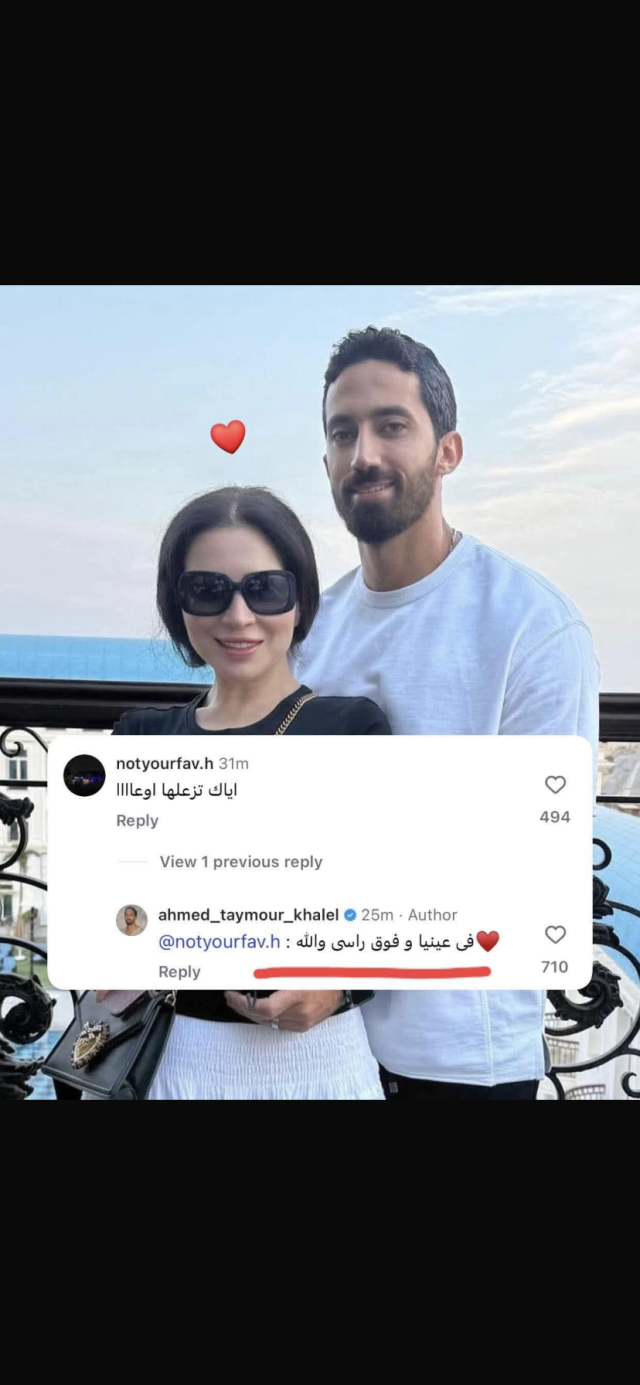 بينما رد أحمد تيمور على تامر حسني ممازحًا إياه بالإشارة إلى الدور الشهير الذي قدّمته مي عزالدين أمام تامر حسني، حيث كتب: “سلمى في عينيا يا عمر متقلقش» ما حمل طابعًا شخصيًا يدل على علاقة قوية بينهم”.