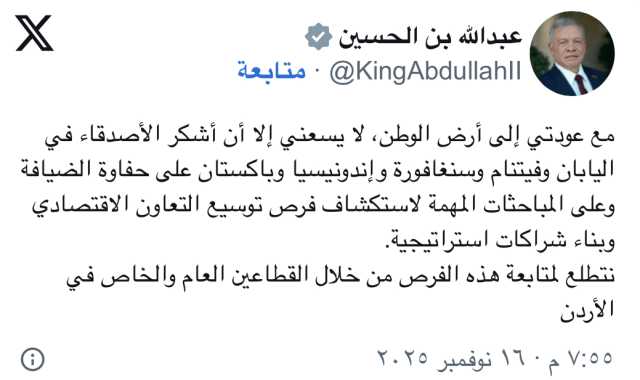 وقال جلالته في منشور على منصة “إكس” إن الأردن يتطلع إلى متابعة هذه الفرص عبر القطاعين العام والخاص.