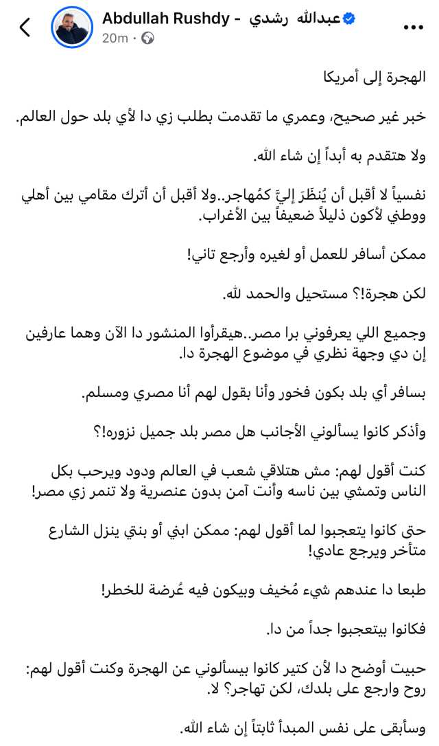 واختتم رشدي أنه حرص على نشر هذا التوضيح بعد كثرة الأسئلة التي تلقاها حول مسألة الهجرة، مؤكدًا: “روح وارجع على بلدك.. لكن تهاجر؟ لا. وسأبقى على نفس المبدأ ثابتاً إن شاء الله.”