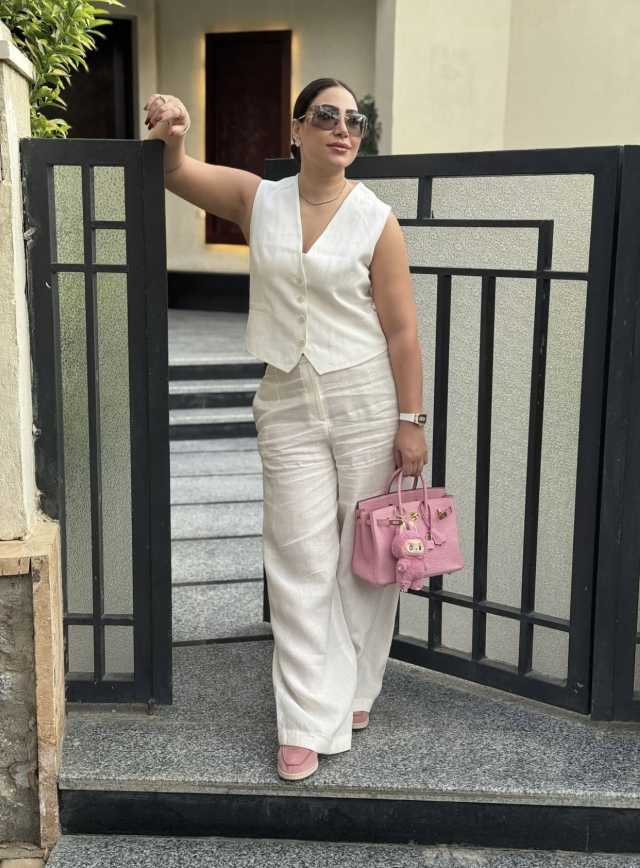 وأكملت الإطلالة بحقيبة يد وردية لافتة تحمل إكسسوارًا صغيرًا بنفس اللون، إلى جانب حذاء وردي متناسق مع لون الحقيبة.
