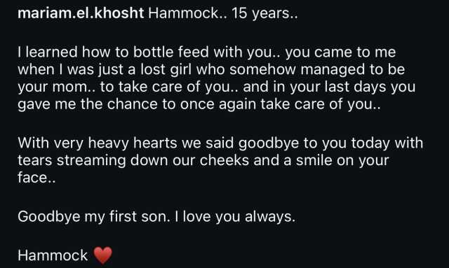 ونشرت له عدة صور عبر حسابها الشخصي بموقع إنستجرام وعلقت عليها قائلة: “جيتلي وأنا بنت تايهة وبطريقة ما بقيت أمك عشان أهتم بيك، وفي آخر أيامك اديتني فرصة أهتم بيك تاني”.