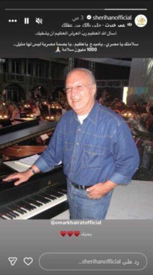 شريهان لـ عمر خيرت: سلامتك يا مصري يا مبدعوشاركت شريهان متابعيها بـ «إنستجرام» صورة للموسيقار عمر خيرت، وكتبت: «أسأل الله العظيم رب العرش العظيم أن يشفيك، سلامتك يا مصري، يا مبدع، يا عظيم، يا بسمة مصرية ليس لها مثيل 1000 مليون سلامة».