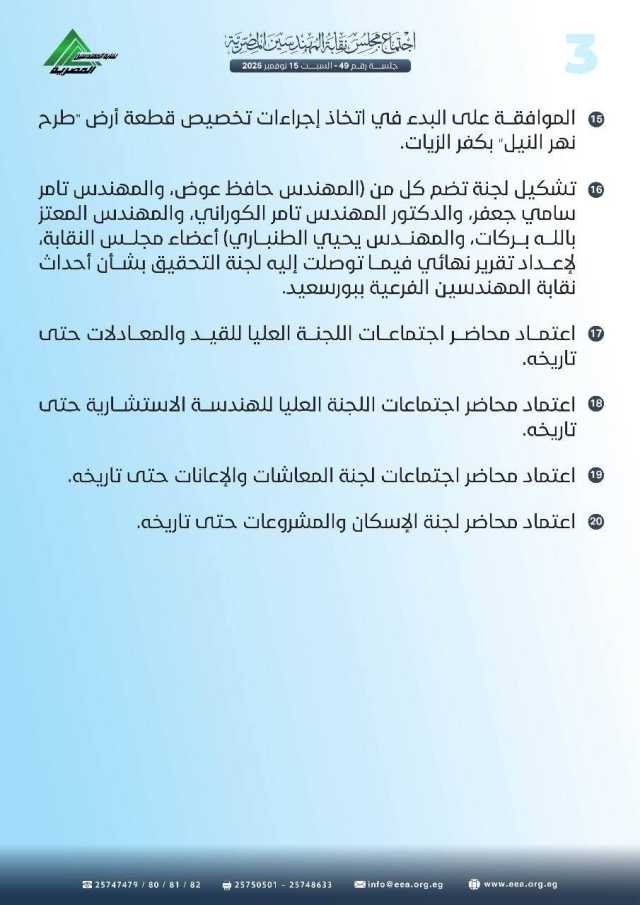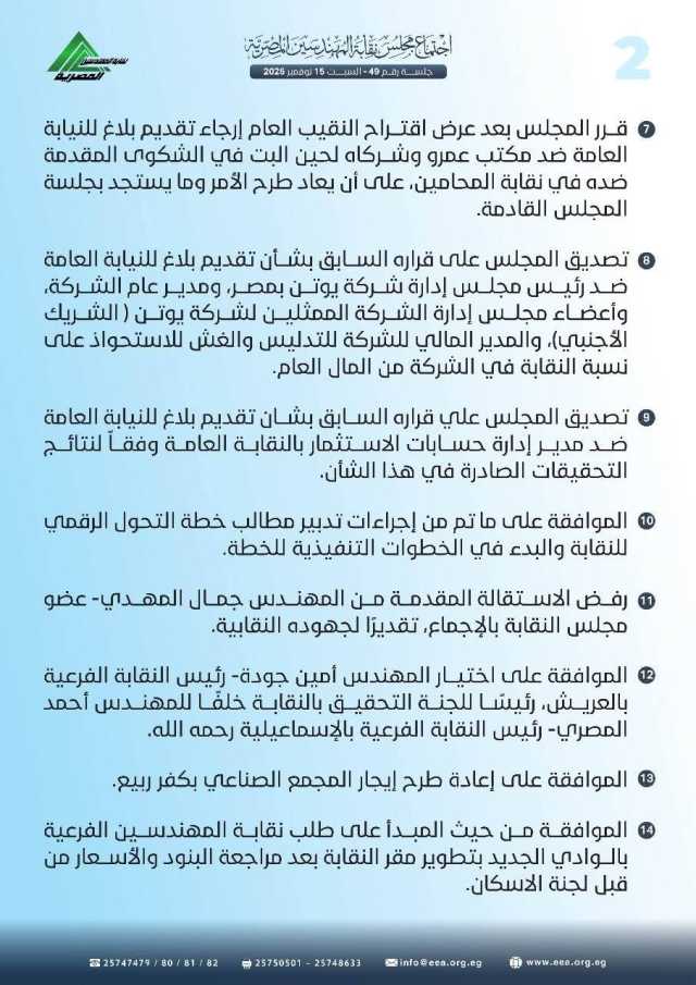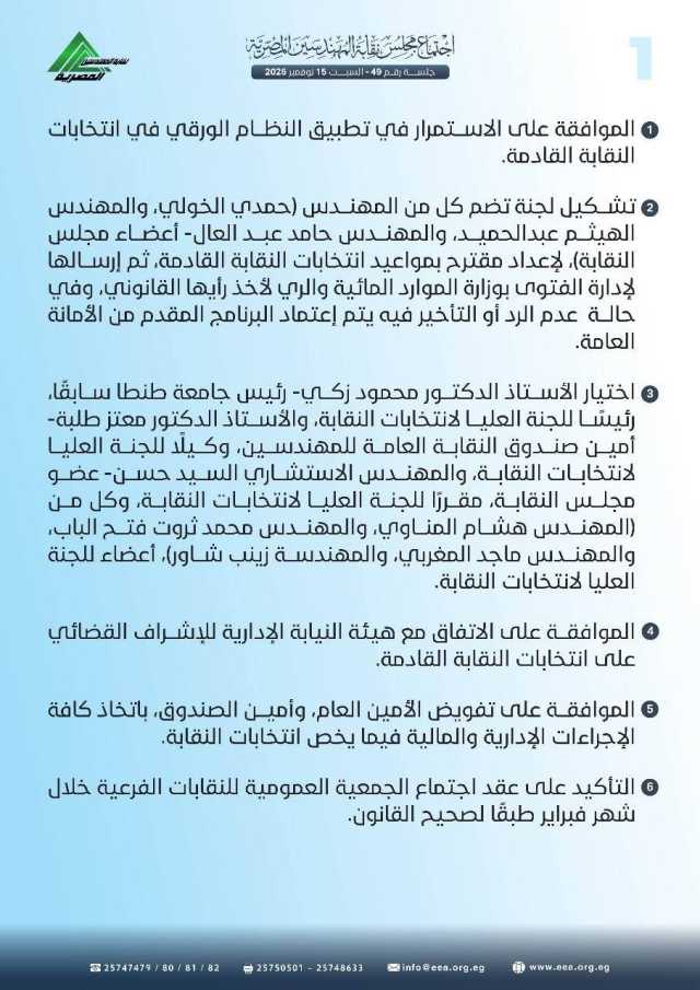وافق المجلس على الاستمرار في تطبيق النظام الورقي في انتخابات النقابة القادمة 2026.تشكيل اللجنة العليا لانتخابات النقابة القادمة، وتتكون من: الدكتور محمود زكي، رئيس جامعة طنطا سابقًا، رئيسًا للجنة، الدكتور معتز طلبة، أمين صندوق النقابة، وكيلًا للجنة، وعضوية المهندس هبة الشرقاوي، والمهندس ثروت فتح الباب، والمهندس ماجد المغربي، والمهندسة زينب شاور، والمهندس الاستشاري السيد حسن.تشكيل لجنة من المهندس حمدي الخولي، والمهندس الهيثم عبدالحميد، والمهندس حامد عابد العال لإعداد مقترح بمواعيد الانتخابات القادمة.وافق المجلس على الاتفاق مع هيئة النيابة الإدارية للإشراف القضائي على الانتخابات القادمة.تفويض الأمين العام، وأمين الصندوق باتخاذ كافة الإجراءات الإدارية والمالية الخاصة بالانتخابات.عقد اجتماع الجمعية العمومية للنقابات الفرعية خلال شهر فبراير طبقًا لصحيح القانون.تشكيل لجنة تضم المهندس حافظ عوض، والمهندس تامر سامي جعفر، والدكتور المهندس تامر الكوراني، والمهندس المعتز بالله بركات، والمهندس يحيى الطنطاوي، لإعداد تقرير نهائي بشأن أحداث نقابة المهندسين الفرعية ببورسعيد.إرجاء التوقيع على قرار نقيب المحامين بشأن تأجيل النظر في طلب تقديم بلاغ ضد مكتب عمرو وشركاه لحين البت في الشكوى المقدمة ضده في نقابة المحامين، على أن يعاد طرح الأمر في الجلسة القادمة.رفض استقالة المهندس جمال المهدي، عضو مجلس النقابة، بالإجماع، تقديرًا لجهوده النقابية.اختيار المهندس أمين جودة، رئيس النقابة الفرعية بالعريش، رئيسًا للجنة التحقيق بالنقابة، خلفًا للمهندس أحمد المصري.صدق المجلس على قرارات سابقة بشأن تقديم بلاغات للنيابة العامة ضد رئيس وأعضاء مجلس إدارة إحدى الشركات، ومديريها الماليين، وكذلك ضد مدير إدارة حسابات الاستثمار بالنقابة، وفقًا لنتائج التحقيقات.الموافقة على ما تم من إجراءات ومطالب خطة التحول الرقمي للنقابة، والبدء في الخطوات التنفيذية للخطة.وافق المجلس على البدء في إجراءات تخصيص قطعة أرض "طرح نهر النيل" بكفر الزيات.وافق المجلس على إعادة طرح إيجار المجمع الصناعي بكفر ربيع.الموافقة مبدئيًا على طلب نقابة المهندسين الفرعية بالوادي الجديد لتطوير مقر النقابة، بعد مراجعة البنود والأسعار.تم اعتماد محاضر اجتماعات اللجنة العليا للقيد والمعادلات، ولجنة الهندسة الاستشارية، ولجنة المعاشات والإعانات، ولجنة الإسكان والمشروعات حتى تاريخه.