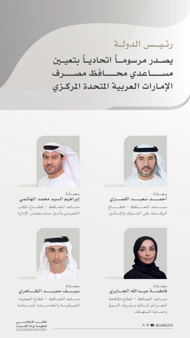 أصدر صاحب السمو الشيخ محمد بن زايد آل نهيان، رئيس الدولة، حفظه الله، مرسوماً اتحادياً بتعيين مساعدي محافظ مصرف الإمارات العربية المتحدة المركزي.وفق الحساب الرسمي للمكتب الإعلامي لحكومة دولة الإمارات على منصة إكس. وهم: