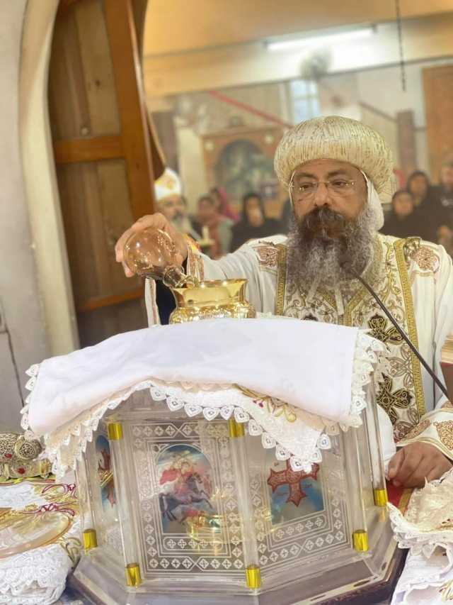 وخلال صلوات القداس الإلهي قام نيافته بتطييب رفات الشهيد العظيم مارجرجس، وتدشين عدد من أواني المذبح والمجامر، كما قام نيافته أيضًا بسيامة عدد من أبناء الكنيسة شمامسة برتبة أغنسطس.