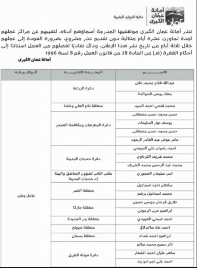 أنذرت #أمانة_عمان_الكبرى، اليوم الأثنين، 32 موظفاً بالفصل من العمل، بسبب تغيبهم عن مراكز عملهم لأكثر من 10 أيام متتالية دون تقديم عذر مشروع.