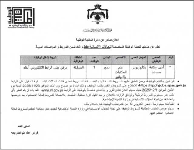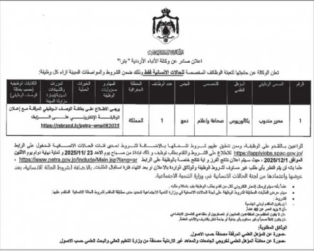 صراحة نيوز-أعلنت مؤسسات حكومية اليوم الاثنين، عن وظائف شاغرة مخصصة للحالات الانسانية فقط، وضمن شروط معينة.