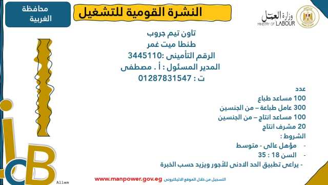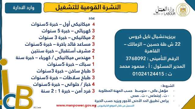كلمات دلالية: وزارة العمل فرص عمل بالداخل النشرة القومية للتوظيف فرص عمل من خلال عمل فی