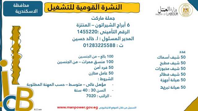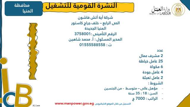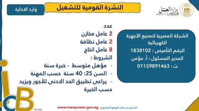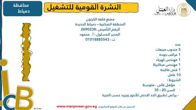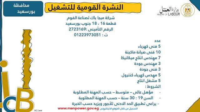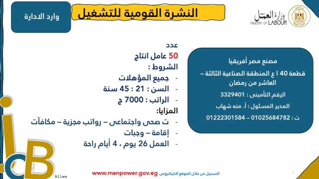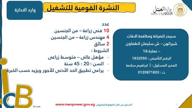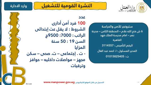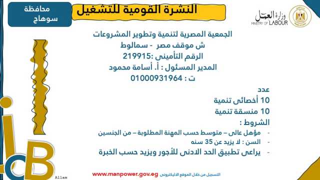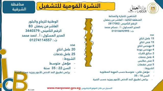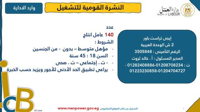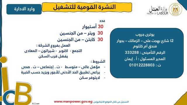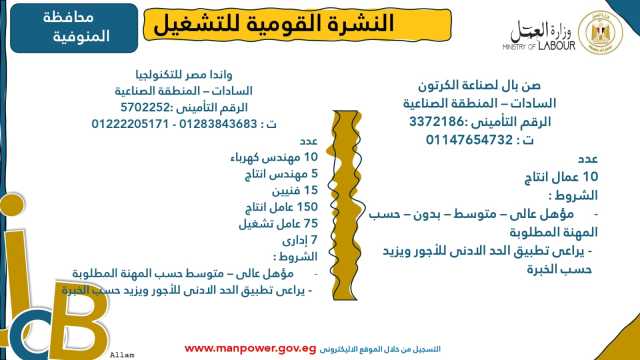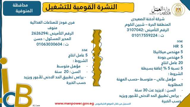وأشارت الوزارة إلى أن نشرة التوظيف نصف الشهرية تُصدر بانتظام كل 15 يومًا من خلال الإدارة العامة للتشغيل برئاسة هبة أحمد، وإعداد منى شوقي – باحث أول بالإدارة، وتتضمن أحدث فرص العمل المتاحة في مختلف المحافظات...وأكدت الوزارة أن النشرة تتضمن مجموعة من الوظائف المخصصة لذوي الهمم، تنفيذًا لأحكام القانون رقم 10 لسنة 2018 بشأن حقوق الأشخاص ذوي الإعاقة، الذي يُلزم المنشآت بتخصيص نسبة 5% من إجمالي عمالها لهذه الفئة...ويأتي ذلك ضمن خطة الوزارة لحصر وتدريب وتشغيل ذوي الهمم ودمجهم في سوق العمل، تنفيذًا لتوجيهات فخامة الرئيس عبدالفتاح السيسي، رئيس الجمهورية، بتمكينهم اقتصاديًا ومجتمعيًا، وتوفير فرص عمل لائقة تحقق لهم الدمج الكامل والمستدام.