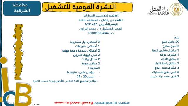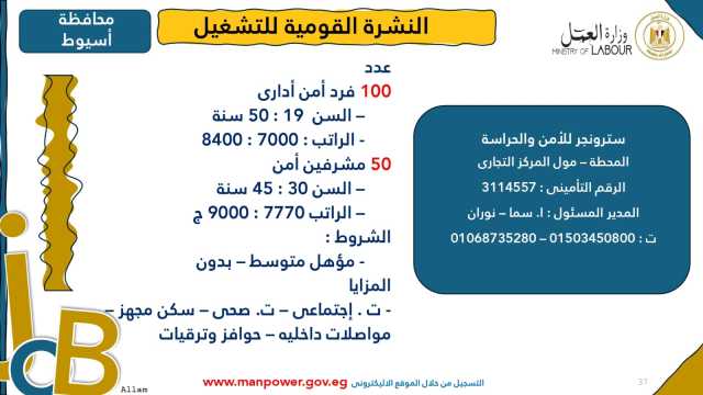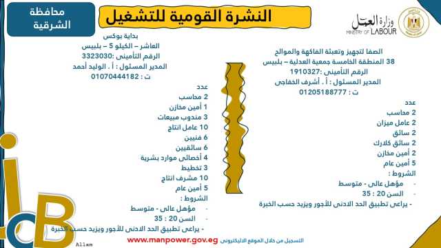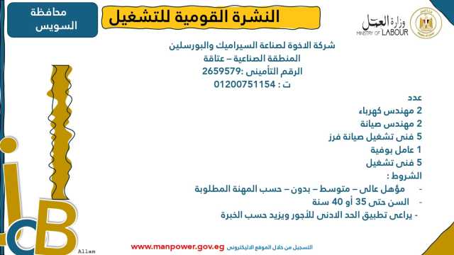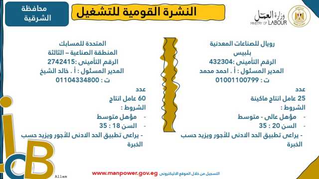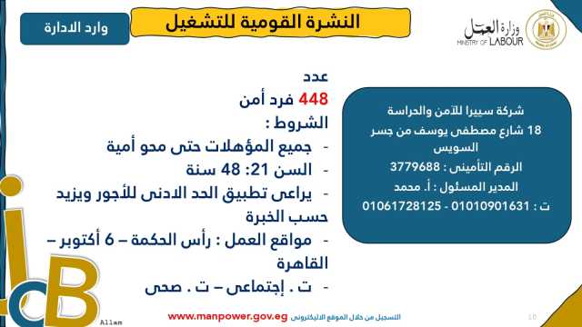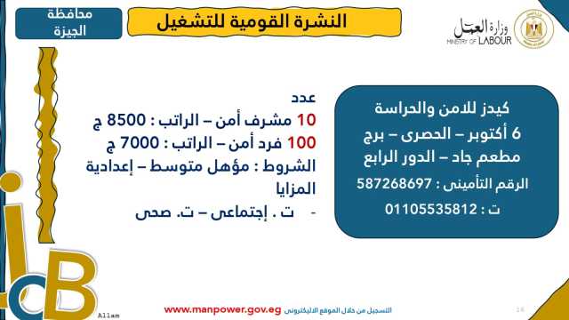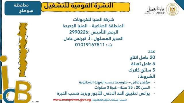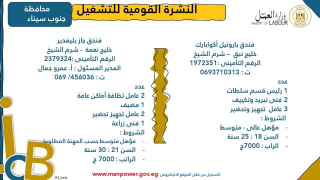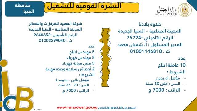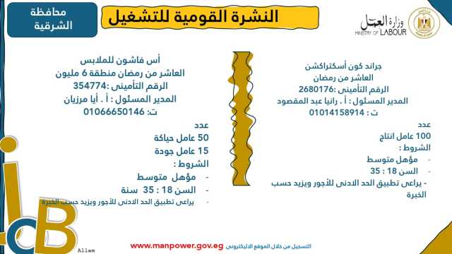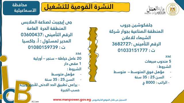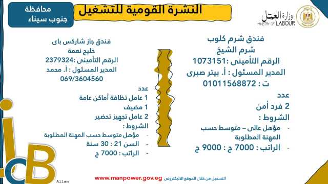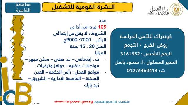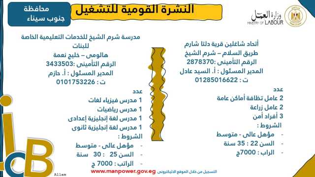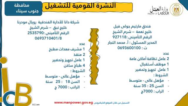وأوضحت الوزارة في بيانها أن 53 شركة من القطاع الخاص في 14 محافظة أبدت استعدادها لتوفير 4202 فرصة عمل جديدة في عدد من التخصصات والمهن المختلفة، منها فرص مخصصة لأصحاب القدرات الخاصة (ذوي الهمم)، برواتب مجزية تُحدد وفقًا لطبيعة المقابلة الشخصية، مع الالتزام الكامل بتطبيق الحد الأدنى للأجور، فضلًا عن الاستفادة من منظومة التأمين الصحي والاجتماعي...وتشمل النشرة الحالية فرصًا متاحة في 14 محافظة هي: القاهرة، الجيزة، المنوفية، السويس، الغربية، جنوب سيناء، سوهاج، أسيوط، بورسعيد، الإسماعيلية، الإسكندرية، المنيا، دمياط، والشرقية.