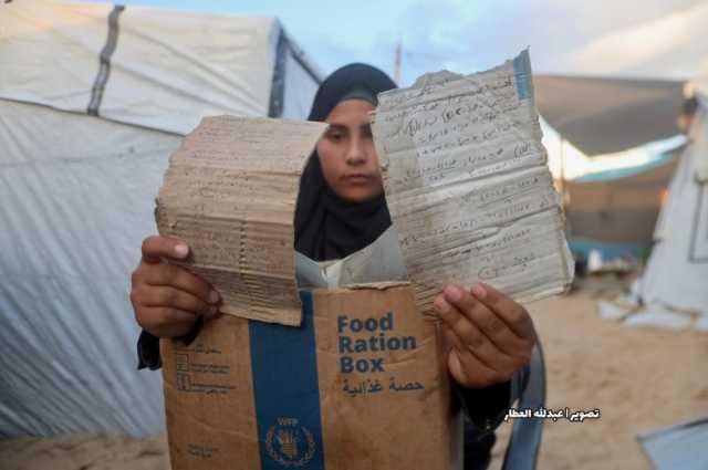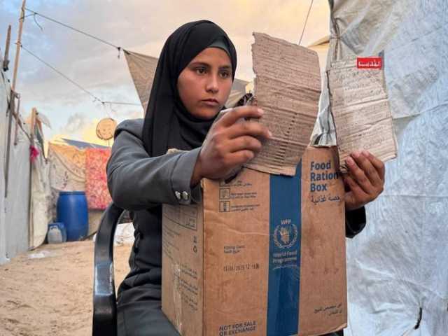 وقالت إنها اضطرت إلى الدراسة والكتابة على كراتين المساعدات بعد أن فقدت كل السّبل التي كانت تمكّنها من الدراسة في ظل العدوان الإسرائيلي، وإغلاق المدارس.