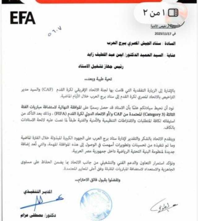 وافق الاتحاد الأفريقي لكرة القدم "كاف" رسميًا على إعادة اعتماد ستاد برج العرب بالإسكندرية لاستضافة المباريات الأفريقية والدولية خلال الفترة المقبلة، وذلك بعد فترة من التوقف بسبب خضوع الملعب لأعمال تطوير وصيانة شاملة.