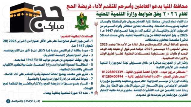 دعا اللواء عماد كدواني، محافظ المنيا، العاملين بديوان عام المحافظة والوحدات المحلية ومديريات الخدمات، وكذلك المحالين للمعاش وأفراد أسرهم من الدرجتين الأولى والثانية، إلى التقدم لأداء فريضة الحج لعام 1447 هـ / 2026 م، وفق الضوابط المعلنة من وزارة التنمية المحلية، والتي حددت عدد 50 تأشيرة مخصصة للعاملين بالمحافظات.