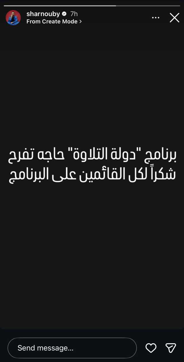 وكتب الشرنوبي عبر ستوري حسابه على موقع التواصل الاجتماعي انستجرام: “برنامج دولة التلاوة حاجة تفرح شكرا لكل القائمين على البرنامج”.