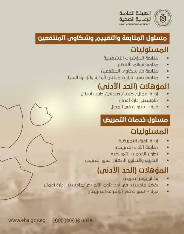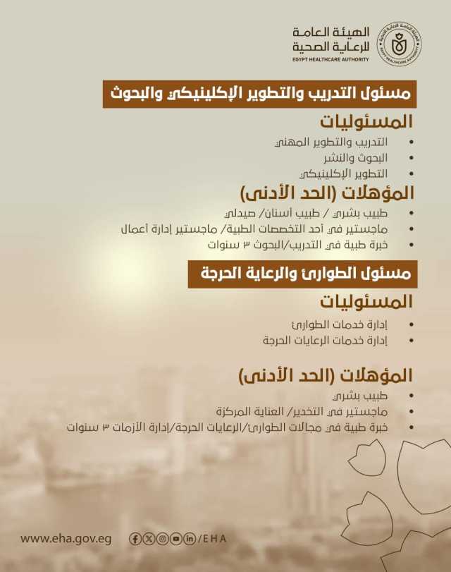أعلنت الهيئة العامة للرعاية الصحية عن حاجتها لشغل عدد من الوظائف التنفيذية بالمقر الرئيسي بالإدارة المركزية للرعاية الصحية والعلاجية، وذلك بنظام الندب أو الإعارة أو التعاقد، وفقًا للاشتراطات والضوابط المعتمدة.