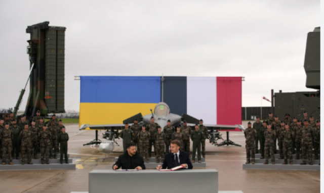 وفي استعراض قوي للتعاون العسكري الفرنسي الأوكراني، وقع الزعيمان الاتفاقية أمام طائرة "رافال" محملة بقنابل AASM الموجهة، وبجوار صاروخ كروز SCALP الذي سبق أن أرسلته باريس بالفعل إلى كييف، وكان الزعيمان مُحاطين بالنظام الصاروخي الاعتراضي SAMP/T ونظام رادار GF300 الذي أرسلته فرنسا أيضا إلى أوكرانيا.