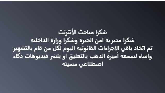 نشرت المهندسة أميرة حسان الشهيرة بـ"أميرة الذهب" منشور عبر صفحتها الرسمية على موقع التواصل الاجتماعي فيسبوك تتقدم فيه بالشكر للأجهزة الأمنية ووزارة الداخلية لسرعة اتخاذ الاجراءات القانونية في مقطع الفيديو الفاضح المنسوب لها على مواقع التواصل الاجتماعي.