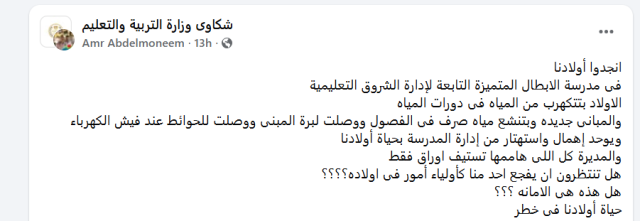 كتب عمر عبد المنعم ولي أمر استغاثة عاجلة على جروب شكاوى وزارة التربية والتعليم، أكد خلالها أنه فى مدرسة الأبطال المتميزة التابعة لإدارة الشروق التعليمية يتعرض طلابها للصعق الكهربائي.