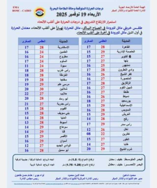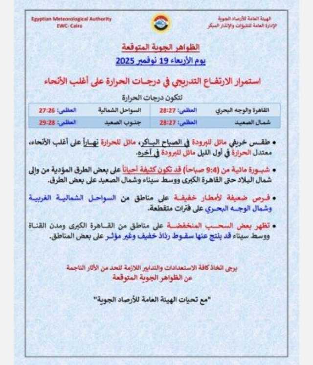 العظمى بالقاهرة 28.. الأرصاد تعلن حالة طقس غدا الأربعاء 19 نوفمبر | بيان بدرجات الحرارة
