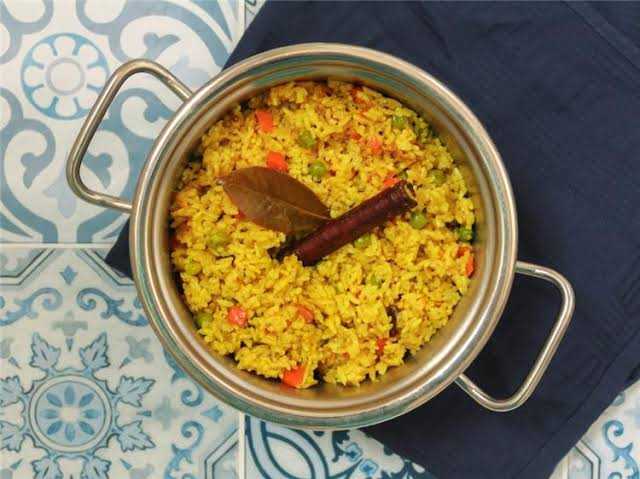 الماء الدافئ.ورق لورا حسب الرغبة.1 ملعقة صغيرة من القرفة.1 ملعقة صغيرة من الفلفل الأسود.2 حبة من القرنفل.1 ملعقة صغيرة من الملح.1 ليمونة مجففة.2 ملعقة كبيرة من الزبدة.1 ملعقة صغيرة من الزيت.1 بصلة مبشورة.جزر مبشور.1 ملعقة صغيرة من الكاري.1 ملعقة صغيرة من الكركم.3 فصوص من الحبهان.