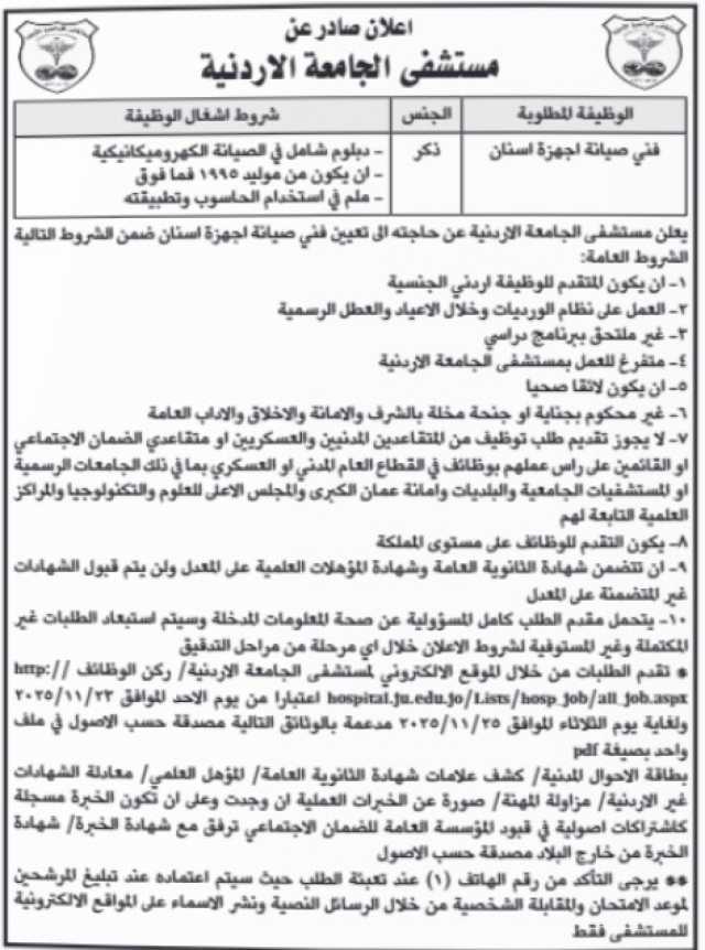 أما وظيفة فني قيادة سيارة اسعاف طبية مجهزة فتتطلب الحصول على مؤهل فني متوسط أو فوق متوسط يتلاءم مع طبيعة مهام الوظيفة، مع التأكيد على عدم قبول طلبات الحاصلين على مؤهلات أعلى أو أقل من المطلوب.