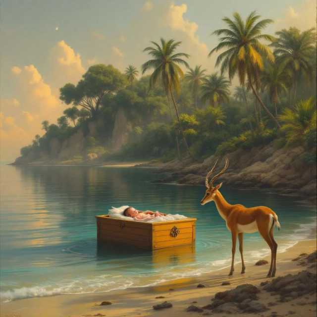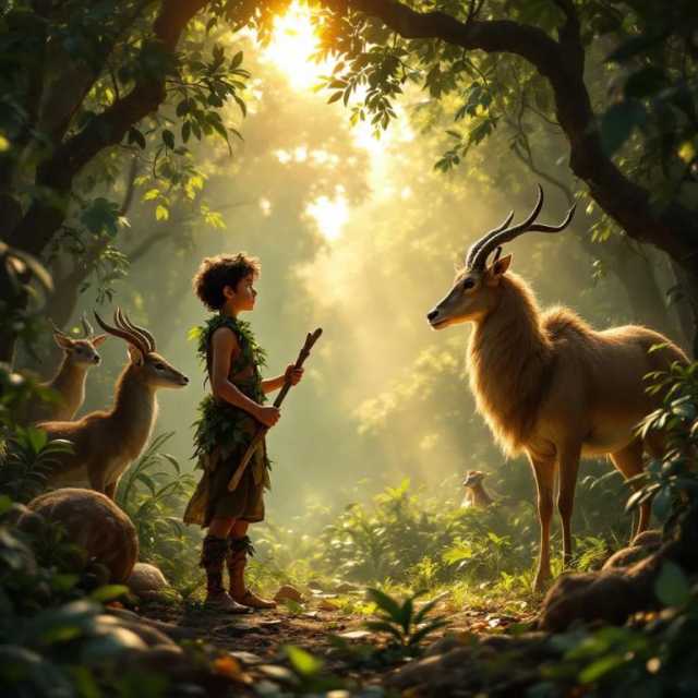 فلما اشتد به الجوع أخذ في الصراخ على نحو ما نعرف من أمر الأطفال، فلما سمعته إحدى الظباء أو الغزلان حنت عليه بعد فقدها لابنها، وتتبعت صوته حتى وصلت إليه، وأرضعته من لبنها، وما زالت تتعهده وتربيه وتدفع عنه الأذى، حتى صارت له الظبية أما جديدة، وهو الذي لا يعرف أمه الأولى ولا يتذكرها.