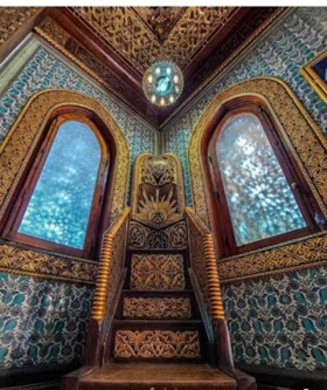 • متحف قصر المنيل: يعرض منبر خشبي مطعّم بالعاج والأبنوس يعكس دمج الأمير محمد علي بين التراث الإسلامي والذوق الفني الحديث.